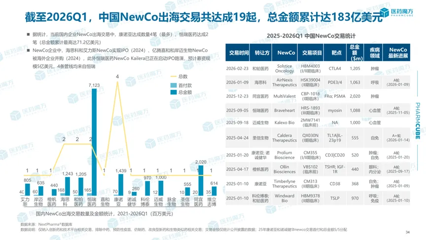 截至2026年第一季度,中国药企通过NewCo交易形式完成19笔交易,总金额累计183亿美元。康诺亚以4笔交易数量领先,恒瑞医药则以71.2亿美元总金额居首,其NewCo
