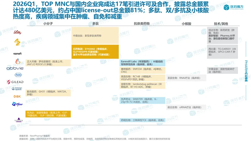 MNC与国内企业完成17笔合作,总金额480亿美元,占当季License-out总额81%,聚焦多肽、双多抗及小核酸领域,疾病覆盖肿瘤、自免与减重。礼来、赛诺菲、阿斯利康等巨头活跃,如正大天晴将已上市JAK1/2抑制剂罗伐昔替尼授权赛诺菲,先为达生物与辉瑞合作的埃诺格鲁肽已获批上市,药明生物向GSK授权三特异性TCE。这种全球研发加区域深耕的模式,既加速中国管线融入国际体系,也为本土企业带来技术与商业化赋能。