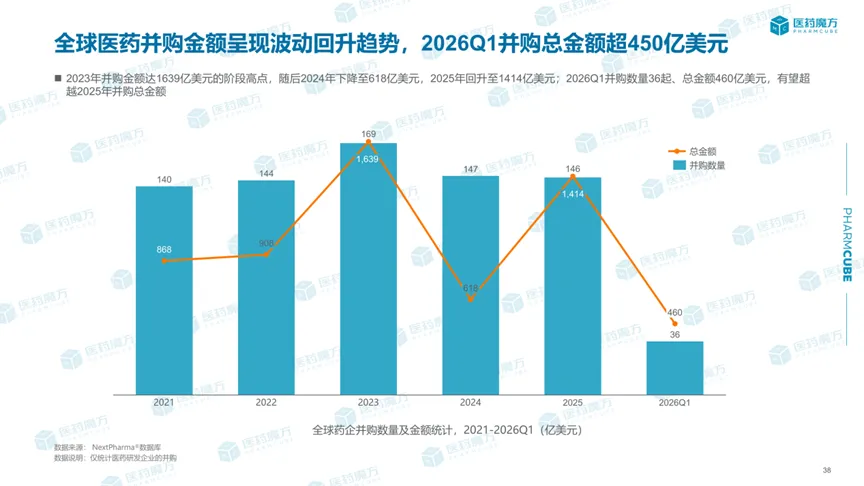 2026年第一季度,全球医药并购市场企稳回升。据统计,当季全球医药研发企业并购共计36起,总金额达460亿美元,虽交易数量维持在相对低位,但金额较2025年同期有所恢复。回顾近五年数据,交易数量逐渐趋于平稳,但资金活跃度明显提升,全球并购总额在2023年达到1639亿美元的峰值后经历阶段性回调,2024年回落至618亿美元,2025年回升至1414亿美元,预计至年底将超越2025年并购总金额。