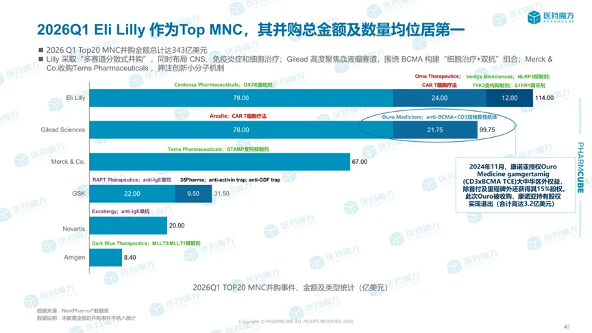 MNC继续主导并购市场,并购总金额达343亿美元,约占当季全球并购总额的75%。其中礼来与吉利德均以78亿美元的交易规模并列首位,前者采取多赛道分散策略,覆盖OX2R激动剂及CAR-T疗法,后者则聚焦血液瘤领域的BCMA靶点细胞治疗与双抗组合。默沙东以67亿美元收购Terns