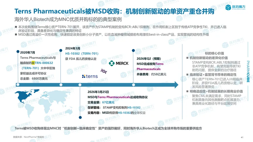 Pharmaceuticals成为当季典型案例,其核心资产TERN-701是一款具有差异化机制的STAMP变构BCR::ABL1抑制剂,该药物曾于2020年与翰森制药达成大中华区合作,并于2024年获得FDA孤儿药资格,最终以高溢价被跨国药企锁定,反映出具备明确临床优势的海外华人Biotech正成为国际资本重仓的对象。
