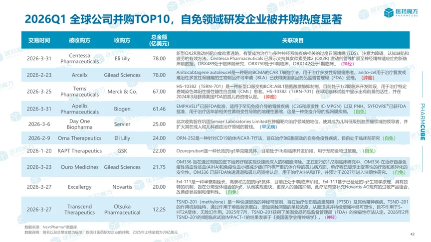 从细分领域来看,自免领域研发企业在当季并购中热度显著。在2026年第一季度全球医药并购TOP10榜单中,自免相关交易占据五席,涉及补体抑制剂、抗IgE单抗及体内CAR-T等多种技术路径。与此同时,神经科学、肿瘤及罕见病领域也均有大额交易达成。整体而言,当前全球医药并购呈现出金额温和回升、交易向头部资产集中的特征,Top