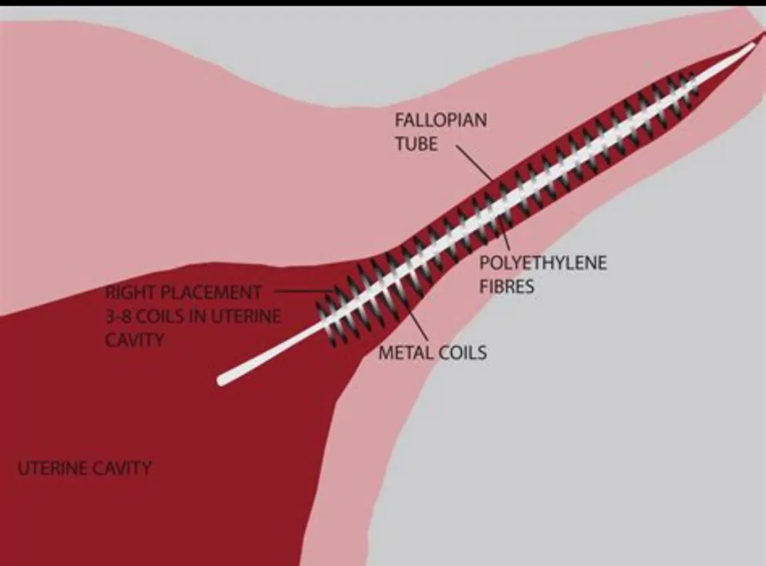 植入流程:经阴道,在宫腔镜引导下将装置送抵输卵管口,释放后自动展开;按设计,随时间完成组织性封堵,实现不可逆避孕。