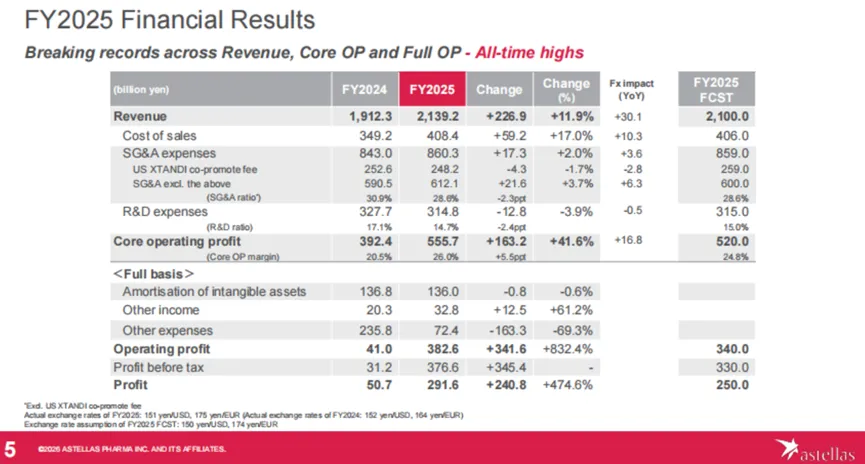 4月27日,安斯泰来发布2025财年(2025年4月1日-2026年3月31日)业绩报告,总营收21392亿日元(约136.10亿美元,按2026年平均汇率100日元=0.6362美元换算,下同),同比增长11.9%(按固定汇率计算,下同)。