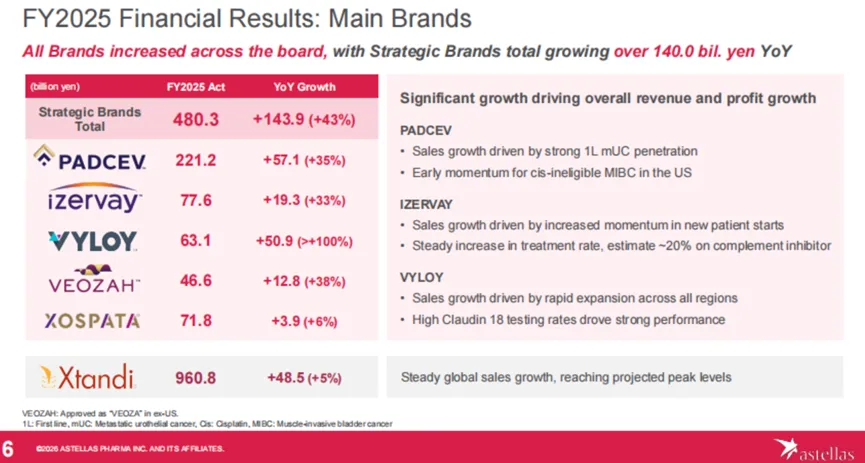 为应对XTANDI即将面临专利悬崖、后续销售逐步下滑的挑战,安斯泰来加速推进创新药梯队接棒,由五大战略品牌(PADCEV、IZERVAY、VYLOY、VEOZAH、XOSPATA)构建起新的增长支柱,全年合计实现销售额4803亿日元(约30.56亿美元,+43%),成为驱动公司业绩增长的主力,其中: