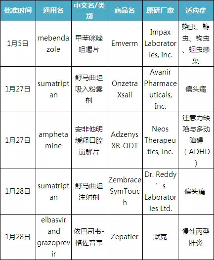 1月28日FDA批准了印度瑞迪博士实验室(Dr. Reddy’s Laboratories Ltd)的舒马曲坦(sumatriptan)注射剂,商品名Zembrace SymTouch。舒马曲坦是一种选择性5-HT1B / ID受体激动剂,药物预装在单只一次性自我注射器中。用于治疗严重的偏头痛发作。