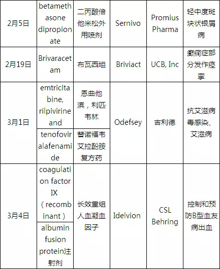 2016年1~3月FDA批准新药表